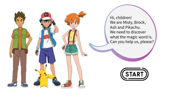 Hi, children! We are Misty, Brock,Ash and Pikachu. We need to discover what the magic word is. Can you help us, please?