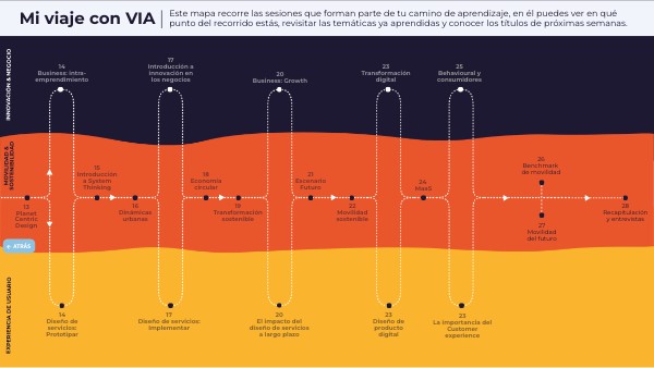 Este mapa recorre las sesiones que forman parte de tu camino de aprendizaje, en él puedes ver en qué punto del recorrido estás, revisitar las temáticas ya aprendidas y conocer los títulos de próximas semanas.