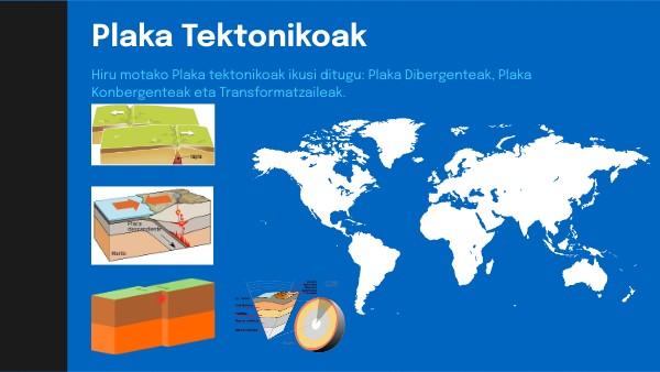 Hiru motako Plaka tektonikoak ikusi ditugu: Plaka Dibergenteak, Plaka Konbergenteak eta Transformatzaileak.
