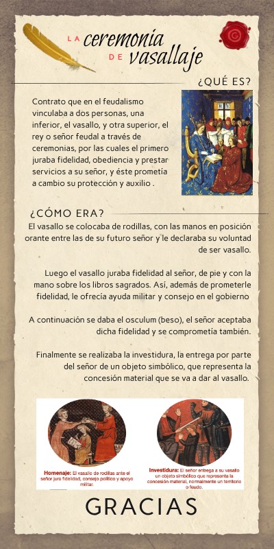 Contrato que en el feudalismo vinculaba a dos personas, una inferior, el vasallo, y otra superior, el rey o señor feudal a través de ceremonias, por las cuales el primero juraba fidelidad, obediencia y prestar servicios a su señor, y éste prometía a cambio su protección y auxilio .