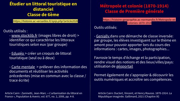 Outils utilisés: - Genially dans une démarche de classe inversée: par groupe, les élèves investiguent sur le thème en amont pour pouvoir apporter lors du cours des informations : cartes, images, photographies... Favrosie le temps d'échange et la participation, rendre visuel des notions et des lieux/villes/pays: utilisation de géoportail Permet également de s'appropier & découvrir les outils numériques et accroître ses compétences.