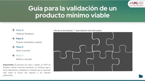 Importante: El proceso de crear y validar un MVP es iterativo, siendo esencial mantener un enfoque ágil y tener disposición a adaptarse a medida que se aprende más sobre el futuro del negocio y los clientes potenciales.