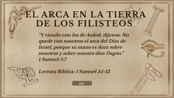 En la historia de hoy vemos el poder de Dios, aunque los filisteos eran hombres paganos y adoraban a varios dioses, Dios permitió que tomaran el arca del pacto, este pueblo pagano pensó que habían derrotado al Dios de Israel, y pusieron el arca, que para ellos era un ídolo, en el templo de su dios, pero el poder de Dios se manifestó, clarificando a los filisteos el poder del Dios vivo y verdadero sobre todos los dioses de la tierra, también los hirió con enfermedades y mortandad, por lo que decidieron devolver el arca del pacto.