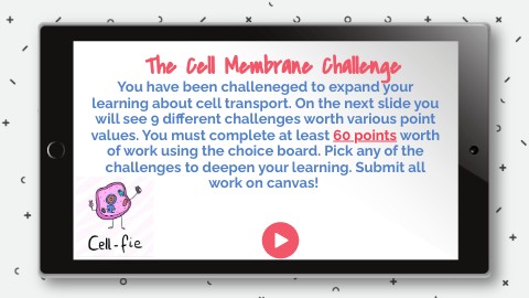 You have been challeneged to expand your learning about cell transport. On the next slide you will see 9 different challenges worth various point values. You must complete at least 60 points worth of work using the choice board. Pick any of the challenges to deepen your learning. Submit all work on canvas!
