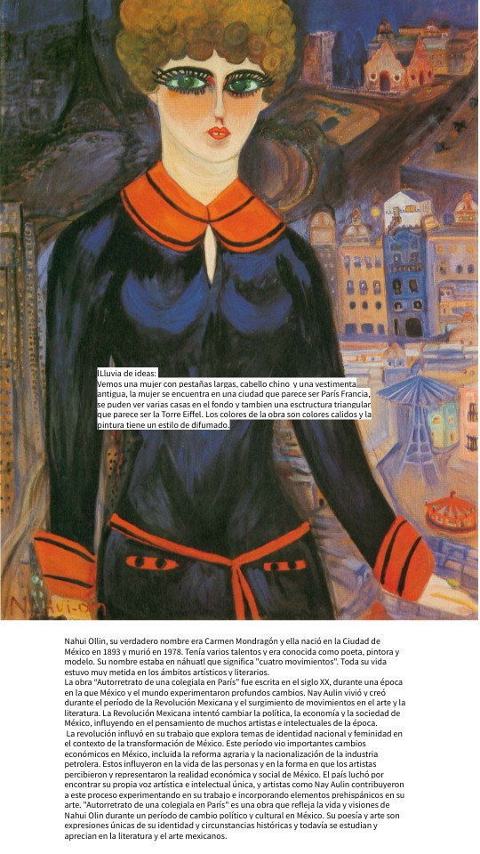 Nahui Ollin, su verdadero nombre era Carmen Mondragón y ella nació en la Ciudad de México en 1893 y murió en 1978. Tenía varios talentos y era conocida como poeta, pintora y modelo. Su nombre estaba en náhuatl que significa "cuatro movimientos". Toda su vida estuvo muy metida en los ámbitos artísticos y literarios. La obra “Autorretrato de una colegiala en París” fue escrita en el siglo XX, durante una época en la que México y el mundo experimentaron profundos cambios. Nay Aulin vivió y creó durante el período de la Revolución Mexicana y el surgimiento de movimientos en el arte y la literatura. La Revolución Mexicana intentó cambiar la política, la economía y la sociedad de México, influyendo en el pensamiento de muchos artistas e intelectuales de la época. La revolución influyó en su trabajo que explora temas de identidad nacional y feminidad en el contexto de la transformación de México. Este período vio importantes cambios económicos en México, incluida la reforma agraria y la nacionalización de la industria petrolera. Estos influyeron en la vida de las personas y en la forma en que los artistas percibieron y representaron la realidad económica y social de México. El país luchó por encontrar su propia voz artística e intelectual única, y artistas como Nay Aulin contribuyeron a este proceso experimentando en su trabajo e incorporando elementos prehispánicos en su arte. "Autorretrato de una colegiala en París" es una obra que refleja la vida y visiones de Nahui Olin durante un período de cambio político y cultural en México. Su poesía y arte son expresiones únicas de su identidad y circunstancias históricas y todavía se estudian y aprecian en la literatura y el arte mexicanos.
