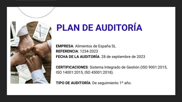 EMPRESA: Alimentos de España SLREFERENCIA: 1234-2023 FECHA DE LA AUDITORÍA: 28 de septiembre de 2023 CERTIFICACIONES: Sistema Integrado de Gestión (ISO 9001:2015, ISO 14001:2015, ISO 45001:2018). TIPO DE AUDITORÍA: De seguimiento 1º año.