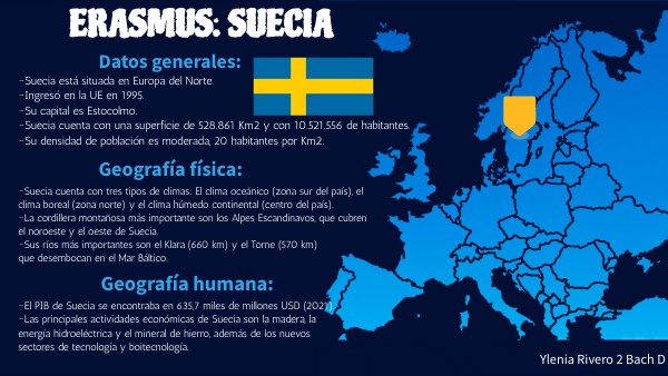 ~Suecia cuenta con tres tipos de climas: El clima oceánico (zona sur del país), el clima boreal (zona norte) y el clima húmedo continental (centro del país).~La cordillera montañosa más importante son los Alpes Escandinavos, que cubren el noroeste y el oeste de Suecia. ~Sus ríos más importantes son el Klara (660 km) y el Torne (570 km) que desembocan en el Mar Báltico.