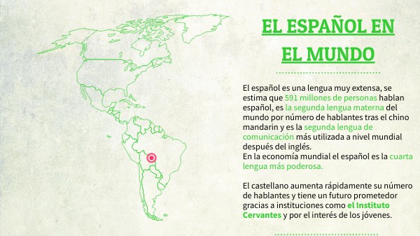 El español es una lengua muy extensa, se estima que 591 millones de personas hablan español, es la segunda lengua materna del mundo por número de hablantes tras el chino mandarin y es la segunda lengua de comunicación más utilizada a nivel mundial después del inglés. En la economía mundial el español es la cuarta lengua más poderosa. El castellano aumenta rápidamente su número de hablantes y tiene un futuro prometedor gracias a instituciones como el Instituto Cervantes y por el interés de los jóvenes.