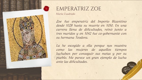Zoe fue emperatriz del Imperio Bizantino desde 1028 hasta su muerte en 1050. En una carrera llena de dificultades, reinó junto a tres maridos y en 1042 fue co-gobernante con su hermana Teodora. La he escogido a ella porque nos muestra como las mujeres de aquellos tiempos luchaban por conseguir sus metas y por su pueblo. Me parece un gran ejemplo de lucha ante las dificultades.