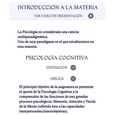 El principal objetivo de la asignatura es presentar el aporte de la Psicología Cognitiva a la comprensión de las funciones de tres grandes procesos psicológicos: Memoria, Atención y Teoría de la Mente (referida ésta a las capacidades interpersonales/intersubjetivas).