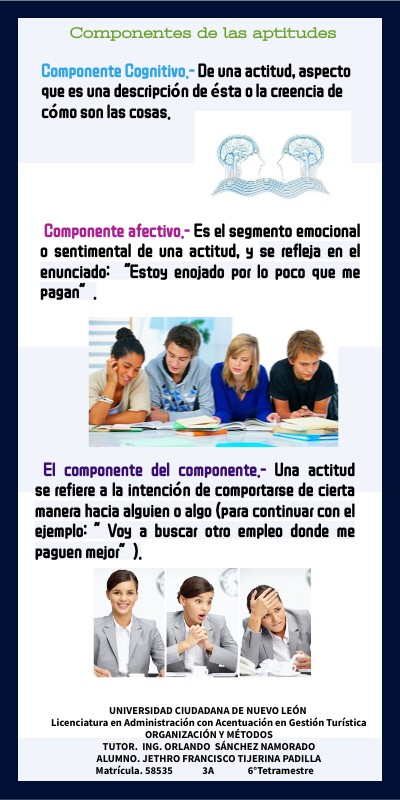 El componente del componente.- Una actitud se refiere a la intención de comportarse de cierta manera hacia alguien o algo (para continuar con el ejemplo: ”Voy a buscar otro empleo donde me paguen mejor”).