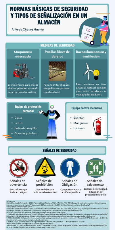 Referencias: Diario Oficial de la Federación. (2018). "Norma Oficial Mexicana PROY-NOM-017-STPS-2017, Equipo de protección personal-Selección, uso y manejo en los centros de trabajo". Recuperado el 27 de septiembre de 2023 de: http://dof.gob.mx/nota_detalle.php?codigo=5509975&fecha=03/01/2018 Diario Oficial de la Federación. (2021). "Norma Oficial Mexicana PROY-NOM-004-STPS-2020, Maquinaria y equipo que se utilizan en los centros de trabajo. Sistemas de protección y dispositivos de seguridad". Recuperado el 27 de septiembre de 2023 de: https://www.dof.gob.mx/nota_detalle.php?codigo=5611061&fecha=08/02/2021 * Inspección técnica de estanterías .(2020). "Medidas preventivas de seguridad en el almacén: Señalización, colores y símbolos normalizados". Recuerado 27 de septiembre de 2023 de: https://inspecciontecnicadeestanterias.com/senales-de-seguridad-en-el-almacen/ * MECALUX. (2020). "Señalización en el almacén: Seguridad y protección de operarios y mercancía". Recuperado 27 de Septiembre de 2023 de: https://www.mecalux.com.mx/blog/senalizacion-almacen * Ractem. (2020). "Normas básicas de seguridad en un almacén". Recuperado el 27 de septiembre de 2023 de: https://www.ractem.es/blog/normas-basicas-seguridad-almacen *Rubio-Ferrer, J.J. & Villarroel-Valdemoro, S. (s/f). "Seguridad y prevención de riesgos en el almacén". Recuperado 27 de septiembre de 2023 de: http://descargas.pntic.mec.es/mentor/visitas/segu_almacen.pdf