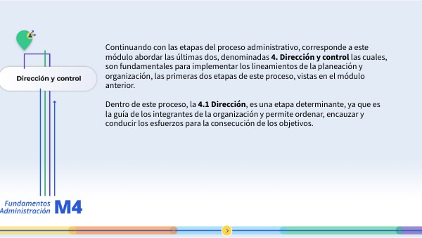 Continuando con las etapas del proceso administrativo, corresponde a este módulo abordar las últimas dos, denominadas 4. Dirección y control las cuales, son fundamentales para implementar los lineamientos de la planeación y organización, las primeras dos etapas de este proceso, vistas en el módulo anterior. Dentro de este proceso, la 4.1 Dirección, es una etapa determinante, ya que es la guía de los integrantes de la organización y permite ordenar, encauzar y conducir los esfuerzos para la consecución de los objetivos.