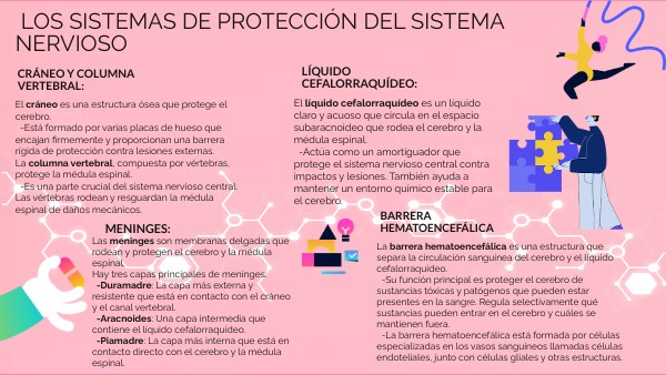 Las meninges son membranas delgadas que rodean y protegen el cerebro y la médula espinal. Hay tres capas principales de meninges: -Duramadre: La capa más externa y resistente que está en contacto con el cráneo y el canal vertebral. -Aracnoides: Una capa intermedia que contiene el líquido cefalorraquídeo. -Piamadre: La capa más interna que está en contacto directo con el cerebro y la médula espinal.