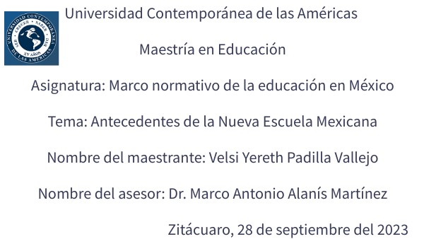 Universidad Contemporánea de las Américas Maestría en Educación Asignatura: Marco normativo de la educación en México Tema: Antecedentes de la Nueva Escuela Mexicana Nombre del maestrante: Velsi Yereth Padilla Vallejo Nombre del asesor: Dr. Marco Antonio Alanís Martínez Zitácuaro, 28 de septiembre del 2023