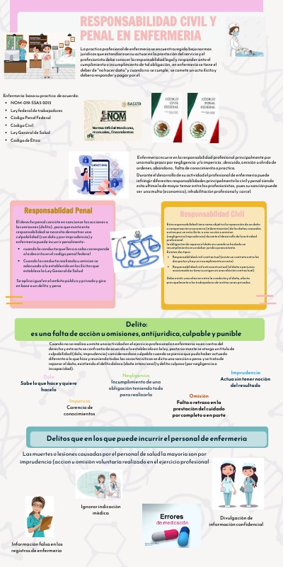 Enfermeria incurre en la responsabilidad profesional principalmente por una mala praxis por negligencia y/o impericia , descuido, omisiòn u olvido de ordenes, abandono , falta de conocimiento o practica.Durante el desarrollo de su actividad el profesional de enfermeria puede infringir diferentes responsablidades principalmente la civil y penal siendo esta ultima la de mayor temor entre los profesionistas, pues su sanciòn puede ser una multa (economico), inhabilitaciòn profesional y carcel.