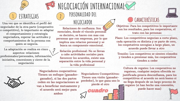 Metas: Se debe tener claro el propósito final de una negociación internaiconal, entre la otra persona y tu. puede ser solo la frima del contrato o llegar a crear una relación para largo plazo