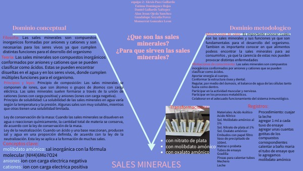 Teoria: Las sales minerales son compuestos inorgánicos conformados por aniones y cationes que se pueden clasificar como ácidos. Estas se pueden encontrar disueltas en el agua y en los seres vivos, donde cumplen múltiples funciones para el organismo.