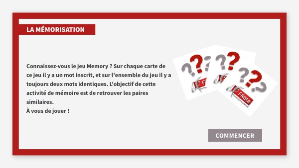 Connaissez-vous le jeu Memory ? Sur chaque carte de ce jeu il y a un mot inscrit, et sur l'ensemble du jeu il y a toujours deux mots identiques. L'objectif de cette activité de mémoire est de retrouver les paires similaires. À vous de jouer !
