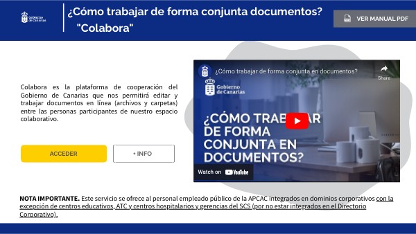 NOTA IMPORTANTE. Este servicio se ofrece al personal empleado público de la APCAC integrados en dominios corporativos con la excepción de centros educativos, ATC y centros hospitalarios y gerencias del SCS (por no estar integrados en el Directorio Corporativo).