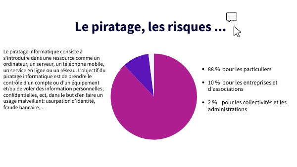 Le piratage informatique consiste à s'introduire dans une ressource comme un ordinateur, un serveur, un téléphone mobile, un service en ligne ou un réseau. L’objectif du piratage informatique est de prendre le contrôle d’un compte ou d’un équipement et/ou de voler des information personnelles, confidentielles, ect, dans le but d’en faire un usage malveillant: usurpation d’identité, fraude bancaire,...