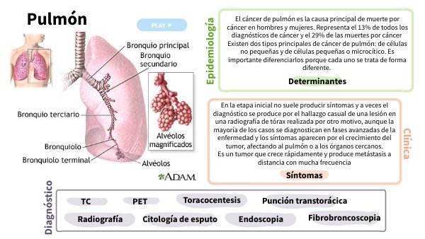 El cáncer de pulmón es la causa principal de muerte por cáncer en hombres y mujeres. Representa el 13% de todos los diagnósticos de cáncer y el 29% de las muertes por cáncer Existen dos tipos principales de cáncer de pulmón: de células no pequeñas y de células pequeñas o microcítico. Es importante diferenciarlos porque cada uno se trata de forma diferente.
