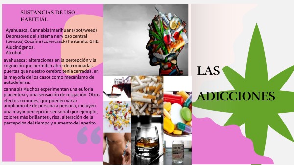 Ayahuasca. Cannabis (marihuana/pot/weed) Depresores del sistema nervioso central (benzos) Cocaína (coke/crack) Fentanilo. GHB. Alucinógenos.Alcohol