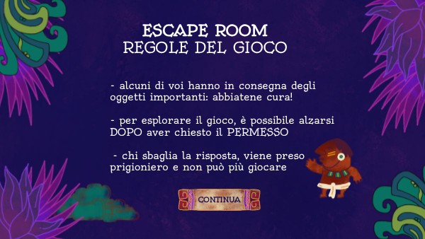 - alcuni di voi hanno in consegna degli oggetti importanti: abbiatene cura! - per esplorare il gioco, è possibile alzarsi DOPO aver chiesto il PERMESSO - chi sbaglia la risposta, viene preso prigioniero e non può più giocare