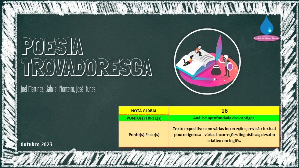 A poesia trovadoresca foi um movimento literário na Idade Média, entre os finais do século XII e o século XIV.Este movimento surgiu principalmente no Norte da península Ibérica.Sendo escritas por trovadores(origem nobre) e jograis(origem popular).