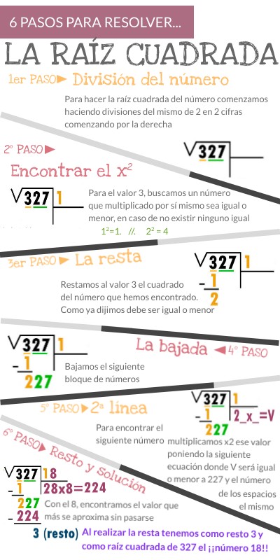 Infografía en 6 pasos para explicar cómo resolver una raíz cuadrada