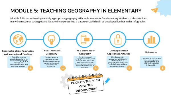 Module 5 discusses developmentally appropriate geography skills and canoncepts for elementary students. It also provides many instructional strategies and ideas to incorporate into a classroom, which will be developed further in this infographic.