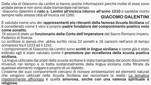 Della vita di Giacomo da Lentini si hanno poche informazioni perché molte di esse sono andate perse e non sono state tramandate nel tempo. Giacomo dalentini è nato a Lentini all’incirca intorno all’anno 1210 e sarebbe morto sempre nello stessa città all’incirca nel 1260. È valutato come uno dei rappresentanti più rilevanti della famosa Scuola Siciliana ed è considerato come il vero e proprio padre fondatore del componimento poetico noto come sonetto. Di sicuro è stato un funzionario della Corte dell’imperatore del Sacro Romano Impero, Federico di Svevia. Lo scrittore si pensa che abbia scritto circa 22 sonetti e 16 canzoni nell’arco di tempo compreso tra il 1233 ed il 1241. I componimenti di Giacomo da Lentini sono scritti in lingua siciliana e come già è stato indicato egli è stato valutato come il promotore per eccellenza della scuola poetica siciliana. La lingua utilizzata dai poeti della scuola siciliana è stata tramandata dai pochi documenti rinvenuti nel tempo e si tratta sostanzialmente della lingua siciliana colta filtrata da qualsiasi elemento volgare e proprio di un dialetto. L’insieme dei suoi componimenti cercano di ricreare ambientazioni ed elementi naturali che vengono utilizzati nella Scuola Siciliana per raccontare la realtà. La tematica maggiormente affrontata è quella amorosa, anche con una valenza spirituale e religiosa.