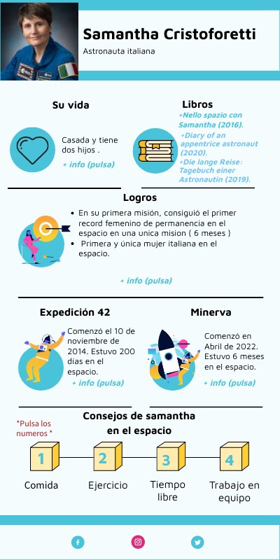 La astronauta Samantha Cristoforetti se levanta cada día a las 7 a.m. y desde muy temprano se dedica a realizar experimentos y llevar a cabo tareas de mantenimiento. A todo ello dedica unas 10 horas al día, mientras que realiza ejercicio durante dos horas. Su día se completa por la participación de reuniones diarias y realizar controles de salud semanales. Pero la vida en el espacio no es solo trabajar. Cristoforetti disfruta de tiempo libre en la Estación Espacial Internacional, en donde aprovecha para relajarse, leer un libro e incluso ¡hacer un tiktok!