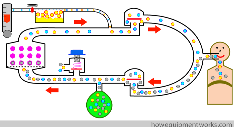 The inhaled delivery of volatile anesthetic agents require that they be vaporized in order to be delivered to the patient with the same accuracy as other gases (O2 and NO2). It enters the fresh gas inlet and the gas starts to flow through the inspiratory unidirectional valve with increased pressure. While the Insp. Unidirectional valve is open the Expiratory has to remain closed. It then travels to the Inspiratory limb and into the patients lungs. Then volatile anesthetic travels to the Expiratory limb after exhalation, to the Exp. Unidirectional valves pressure rises up and lets the volatile anesthetic out. From here the volatile anesthetic can head to etiher the Resevoir bag to allow for the patient to get the next inhalation. Or to the APL valve that will allow pressure control in the breathing circuit, but if there is to much pressure built up it will lead to the Scavenging system and could either collect the volatile anesthetic or let it out into the OR. If the volatile anesthetic makes it to the CO2 absorber it removes the CO2 from the breathing circuit with the help of the granules inside of it. To prevent rebreathing of carbon dioxide that could lead to respiratory acidosis. Once out the process cycles through again.