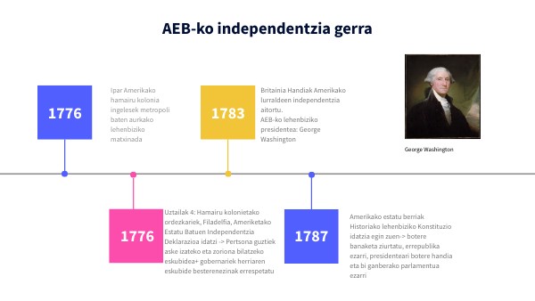 Uztailak 4: Hamairu kolonietako ordezkariek, Filadelfia, Ameriketako Estatu Batuen Independentzia Deklarazioa idatzi -> Pertsona guztiek aske izateko eta zoriona bilatzeko eskubidea+ gobernariek herriaren eskubide besterenezinak errespetatu