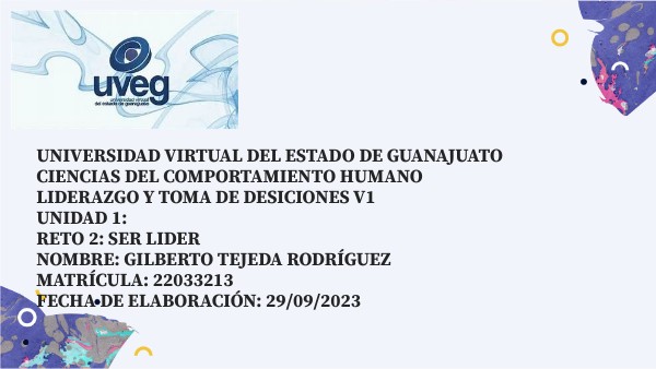 UNIVERSIDAD VIRTUAL DEL ESTADO DE GUANAJUATO CIENCIAS DEL COMPORTAMIENTO HUMANO LIDERAZGO Y TOMA DE DESICIONES V1 UNIDAD 1: RETO 2: SER LIDER NOMBRE: GILBERTO TEJEDA RODRÍGUEZ MATRÍCULA: 22033213 FECHA DE ELABORACIÓN: 29/09/2023