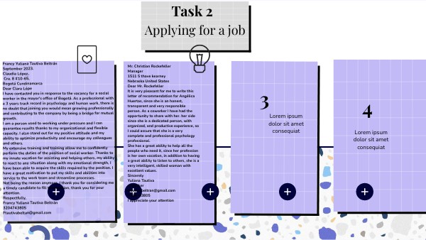 Francy Yuliana Tautiva Beltrán September 2023. Claudia López, Cra. 8 #10-65, Bogotá Cundinamarca Dear Clara Lópe I have contacted you in response to the vacancy for a social worker in the mayor's office of Bogotá. As a professional with a 3 years track record in psychology and human work, there is no doubt that joining you would mean growing professionally and contributing to the company by being a bridge for mutual growth. I am a person used to working under pressure and I can guarantee results thanks to my organizational and flexible capacity. I also stand out for my positive attitude and my ability to optimize productivity and encourage my colleagues and others. My extensive training and training allow me to confidently perform the duties of the position of social worker. Thanks to my innate vocation for assisting and helping others, my ability to react to any situation along with my emotional strength, I have been able to acquire the skills required by the position. I have a great motivation to put my skills and abilities into service to the work team and streamline processes. Not being the reason anymore, I thank you for considering me a timely candidate to fill the position, thank you for your attention. Respectfully, Francy Yuliana Tautiva Beltrán 3204743805 Ftautivabeltan@gmail.com