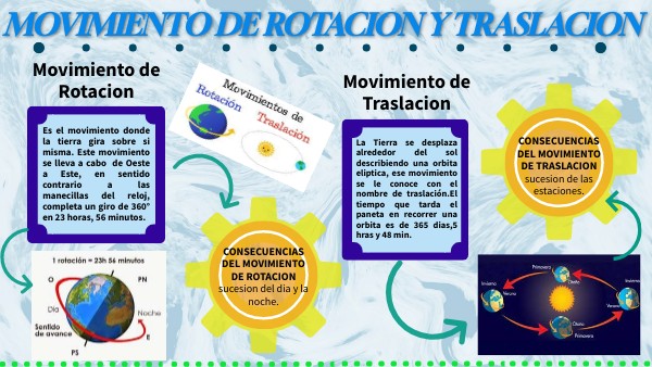 Es el movimiento donde la tierra gira sobre si misma. Este movimiento se lleva a cabo de Oeste a Este, en sentido contrario a las manecillas del reloj, completa un giro de 360° en 23 horas, 56 minutos.