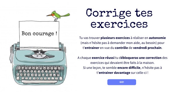 Tu vas trouver plusieurs exercices à réaliser en autonomie (mais n'hésite pas à demander mon aide, au besoin) pour t'entrainer en vue du contrôle de vendredi prochain. A chaque exercice réussi tu débloqueras une correction des exercices qui devaient être faits à la maison. Si une leçon, te semble encore difficile, n'hésite pas à t'entrainer davantage sur celle-ci !