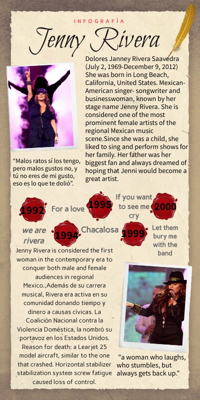 Dolores Janney Rivera Saavedra (July 2, 1969-December 9, 2012) She was born in Long Beach, California, United States. Mexican-American singer- songwriter and businesswoman, known by her stage name Jenny Rivera. She is considered one of the most prominent female artists of the regional Mexican music scene.Since she was a child, she liked to sing and perform shows for her family. Her father was her biggest fan and always dreamed of hoping that Jenni would become a great artist.