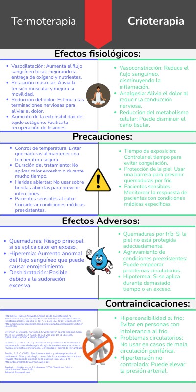 PINHEIRO, Hudson Azevedo. Efeitos agudo da crioterapia na transferencia de peso em sujeitos com hemiparesia espástica crônica. Fisioterapia Brasil, Brasilia, v. 20, n. 1, p. 36-42, 2019. Disponivel em: https://portalatlanticaeditora.com.br/index.php/fisioterapiabrasil/article/view/2330. Swenson C, Swärd L, Karlsson J. Cryotherapy in sports medicine. Scand J Med Sci Sports.2014 Aug;6(4):193-200. doi: 10.1111/j.1600-0838.1996.tb00090.x. PMID: 8896090. Lacerda, É. P. de M. (2019). Avaliação dos protocolos de crioterapia e termoterapia na morbidade pós cirurgia de terceiros molares inclusos : revisão sistemática e metanálise. Universidade Federal de Pernambuco. Sevilla, A. E. C. (2023). Ejercicio terapéutico y crioterapia sobre el rendimiento físico y psicológico de un futbolista amateur tras fractura. Revista Mexicana de Ciencias de la Cultura Física, 2(4), 1–9. https://doi.org/10.54167/rmccf.v2i4.1104 Frederic J. Kottke, Justus F. Lehmann (2000) "Medicina física y rehabilitación" 4ta edición. Editorial Panamericana.