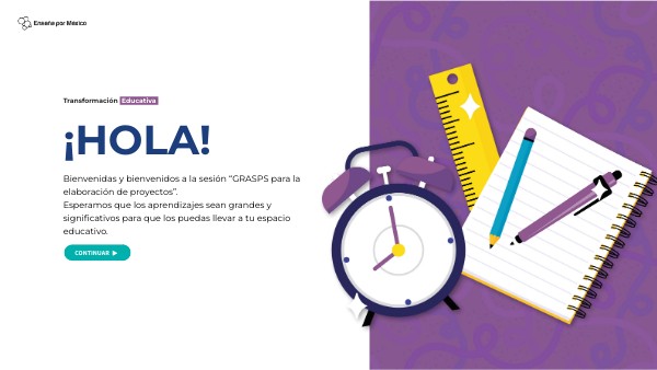 Bienvenidas y bienvenidos a la sesión “GRASPS para la elaboración de proyectos”.Esperamos que los aprendizajes sean grandes y significativos para que los puedas llevar a tu espacio educativo.