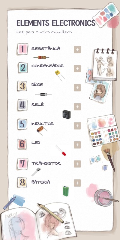 Definició: Un component que permet el pas de corrent en una sola direcció. S'utilitza com a rectificador i com a emissor de llum (díode LED).Polaritat: Té una polaritat específica amb l'ànode (+) i el càtode (-). Mesura: Tensió (voltatge) als seus terminals. Unitat: Volts (V). Símbol: