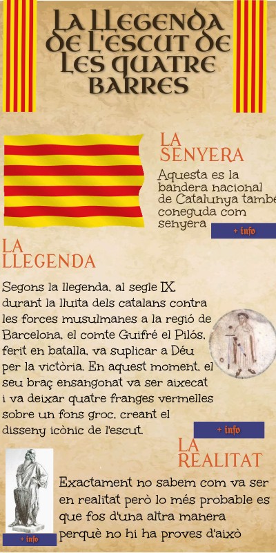Segons la llegenda, al segle IX, durant la lluita dels catalans contra les forces musulmanes a la regió de Barcelona, el comte Guifré el Pilós, ferit en batalla, va suplicar a Déu per la victòria. En aquest moment, el seu braç ensangonat va ser aixecat i va deixar quatre franges vermelles sobre un fons groc, creant el disseny icònic de l'escut.