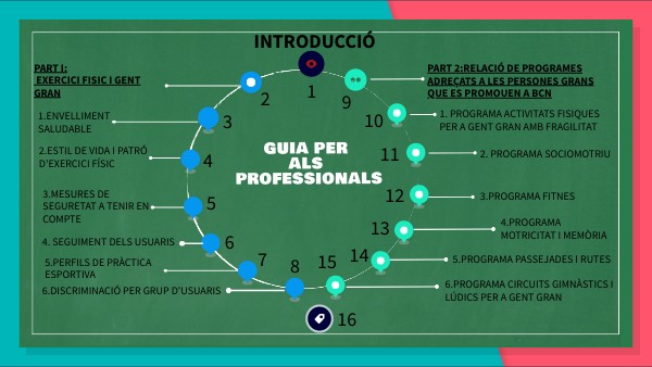 PROGRAMA CIRCUITS GIMNÀSTICS I LÚDICS PER A GENT GRAN1. Presentació:Tenir espais públics per la pràctica esportiva és un progrés urbanístic ecològic i sostenible per la població, on s'intercalen circuits de salut i aparells per la gent gran, i que es veuen reforçats pel gran interés que tenen les persones grans en utilitzar-los, tot i que es troben en una fase de desplegament, encara no n'hi ha gaires, a BCN cada cop n'hi han més.