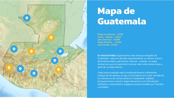 En esta actividad, exploraremos diez áreas protegidas de Guatemala, cada una de ellas representando un valioso tesoro de biodiversidad y patrimonio cultural. creando un mapa interactivo que nos permitirá conocer más sobre estas áreas y apreciar su importancia. Cada área protegida seleccionada pertenece a diferentes categorías de manejo, lo que nos brindará una visión variada de los esfuerzos de conservación en Guatemala. Además, enriqueceremos nuestro mapa interactivo con información relevante y cautivadoras imágenes proporcionadas por fuentes confiables.