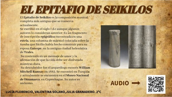 El Epitafio de Seikilos es la composición musical completa más antigua que se conserva actualmente. Se escribió en el siglo I d.c aunque algunos autores lo consideran anterior. Es un fragmento de inscripción epigráfica encontrada en una estela, una columna de mármol colocada sobre la tumba que Sícilio había hecho construir para su esposa Euterpe, en la antigua ciudad helenística de Trales. Su contenido es un mensaje de amor y la afirmación de que la vida debe ser disfrutada mientras dura. Su descubridor fue el arqueólogo escocés William Mitchell Ramsay en 1883. Se encontró en Turquía y actualmente se encuentra en el Museo Nacional de Dinamarca, en Copenhague. Su autor es anónimo.