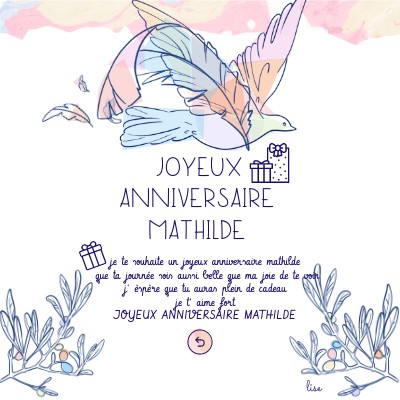 je te souhaite un joyeux anniversaire mathilde que ta journée sois aussi belle que ma joie de te voir j' èspère que tu auras plein de cadeau je t' aime fort JOYEUX ANNIVERSAIRE MATHILDE