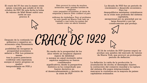 El crack del 29, fue una la mayor crisis jamás conocida que estalló el 24 de octubre de 1929. En esta fecha la bolsa de valores de Wall Street sufrió una caída en sus precios. E
