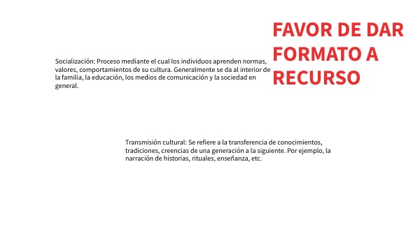 Socialización: Proceso mediante el cual los individuos aprenden normas, valores, comportamientos de su cultura. Generalmente se da al interior de la familia, la educación, los medios de comunicación y la sociedad en general.